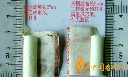 2、煙支過濾嘴不同,真品卷煙濾嘴長25mm,三排激光預(yù)打孔,高透成型紙,有無膠區(qū);假煙濾嘴長27mm,普通成型紙,無打孔。