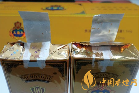 小盒商標(biāo)印刷工藝差異比對(duì):真品小盒商標(biāo)紙正面印刷工藝以藍(lán)色為底燙印“大重九”字樣,邊緣采用精雕細(xì)刻雕版燙金技術(shù),套色燙金均勻完整;假煙小盒商標(biāo)印刷采用“掃描照相”等仿制技術(shù),套色燙金嚴(yán)重失真,商標(biāo)圖案呈現(xiàn)出的效果與真品商標(biāo)圖案差異明顯。