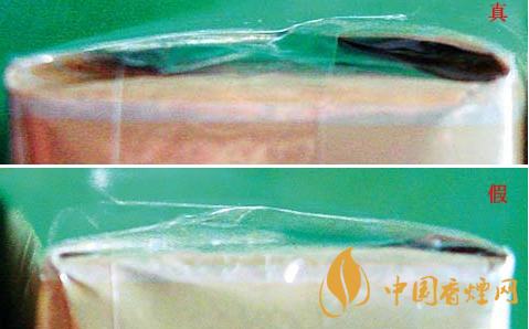 看底部商標(biāo)紙:真煙底部商標(biāo)紙折角處呈弧狀,且間隙大;假煙底部商標(biāo)紙折角處呈銳角,且間隙小。