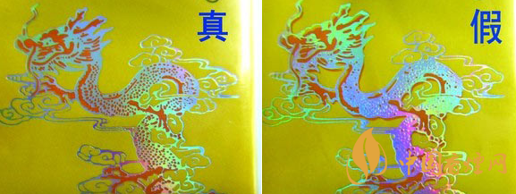 2.真品小盒正面套印定位燙金“飛龍”圖案鱗片清晰,從頭至尾都能看到定位燙金工藝,紅色貫穿整個龍身,“鱗片”是雪里透紅,栩栩如生;假煙套印定位燙金仿制較差,鱗片無法達到真品的印刷工藝水平,與真品存在明顯差異。