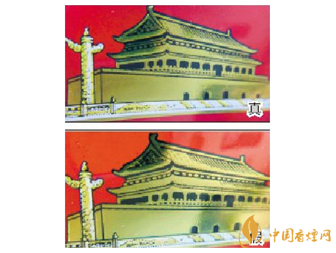 1.小盒正面商標紙?zhí)咨珷C金工藝對比:真煙天安門左側(cè)華表套色均勻,黃白色分布有明顯分界點,邊緣光滑、干凈、清晰;假煙套色較差,黃白色不明顯,黃色部分印刷較分散,字體邊緣套印有毛渣點,呈現(xiàn)鋸齒狀。