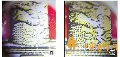 3.小盒背面華表底座微縮印刷工藝差異對比:真煙微縮防偽印刷圖案效果呈現(xiàn)主次分明、清晰度高、套印準確的特點;假煙采用照相或掃描的方法仿制,字體及圖案變形增大,無主次感,微縮字體及圖案比較粗糙,呈現(xiàn)出來的效果是模糊不清的。