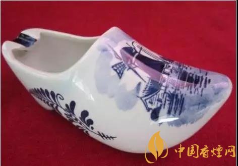 這款工藝煙灰缸是來(lái)自荷蘭的這款煙灰缸,呈尖頭木屐形,底色為白色,除少量文字與邊紋外,圖案皆以藍(lán)色繪之。這款高檔煙灰缸圖片鞋身左右前后都繪有對(duì)稱(chēng)的三葉草圖案;鞋面繪有荷蘭風(fēng)車(chē)、村舍及水田灌木圖案;此外,鞋頭還用淡色繪以藍(lán)天白云,籠罩上空。而鞋口靠近鞋跟方向的邊沿處,設(shè)計(jì)了三個(gè)凹槽,方便多人吸煙時(shí)使用??偠灾且豢铑佒蹬c實(shí)用并存的煙灰缸無(wú)疑了。