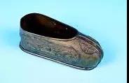這款造型奇特的工藝煙灰缸來(lái)自以色列,為金屬質(zhì)地,外層漆金。整體造型為以色列特有的翹頭鞋,鞋跟處伸出一截短短的煙槽,鞋口則有陰刻的“JERUSALEM”(耶路撒冷)字樣;鞋身用簡(jiǎn)單的黑、紅、黃、白勾勒了具有明顯地域色彩的花紋,如回首的駱駝、椰樹(shù)、城墻等。整件作品的造型和色彩都帶有濃郁的中東風(fēng)情,高檔煙灰缸圖片十分別致。